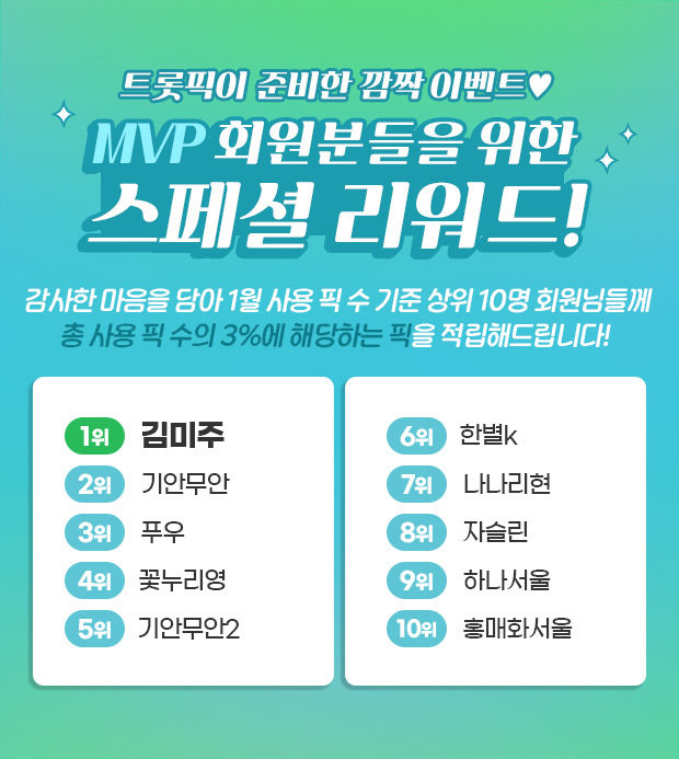 ※MVP 회원의 닉네임 명단이 매월 초 트롯픽 팝업을 통해 공개됩니다.